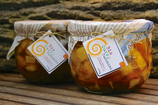 Ab sofort gibt es ein weiteres kulinarisches Produkt aus unserem Permakultur-Garten: Mundgerechte Stückchen aus weißen Zucchinis (Sortenrarität), mit Zwiebelstreifen süß-sauer eingelegt. Für alle die Curry mögen und sich Abwechslung zum normalen essigsauren Gemüse wünschen.